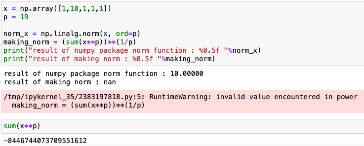 - np.linalg.norm(x, ord=p)의 처리방식을 비교하여 이 문제를 해결할 수 있었다.