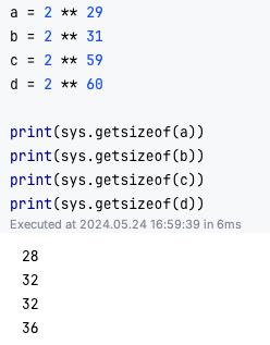 - 파이썬은 임의 정밀도 방식을 채택하여 값이 커질 때마다 4비트씩 메모리를 더 할당하여 더해줌으로써 메모리가 허용하는 최대한의 정수를 표현할 수 있게 한다.